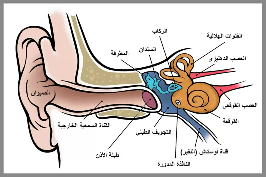 - تتكون الأذن الخارجية من صيوان الأذن (الجزء الخارجي المرئي من الأذن) وتربط القناة السمعية الخارجية الأذن الخارجية بالأذن الوسطى.