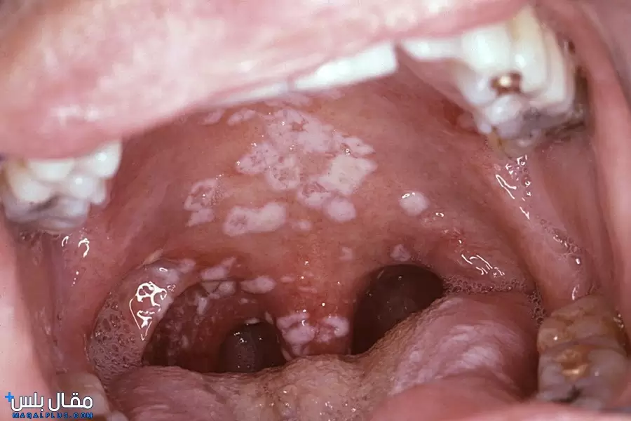 - بقع بيضاء على الخدين الداخليين واللسان وسقف الفم والحلق.